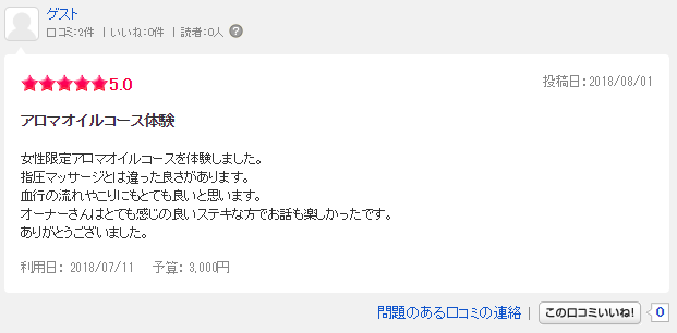 女性限定アロマオイルコースを体験しました。 指圧マッサージとは違った良さがあります。 血行の流れやこりにもとても良いと思います。 オーナーさんはとても感じの良いステキな方でお話も楽しかったです。 ありがとうございました。